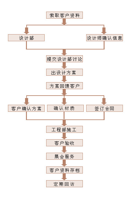 展臺設(shè)計和制作搭建的服務(wù)流程存在因客戶不同參展展會情況有所不同,常見服務(wù)流程還包括已有展臺方案直接報價,參展商展臺的報館流程等。